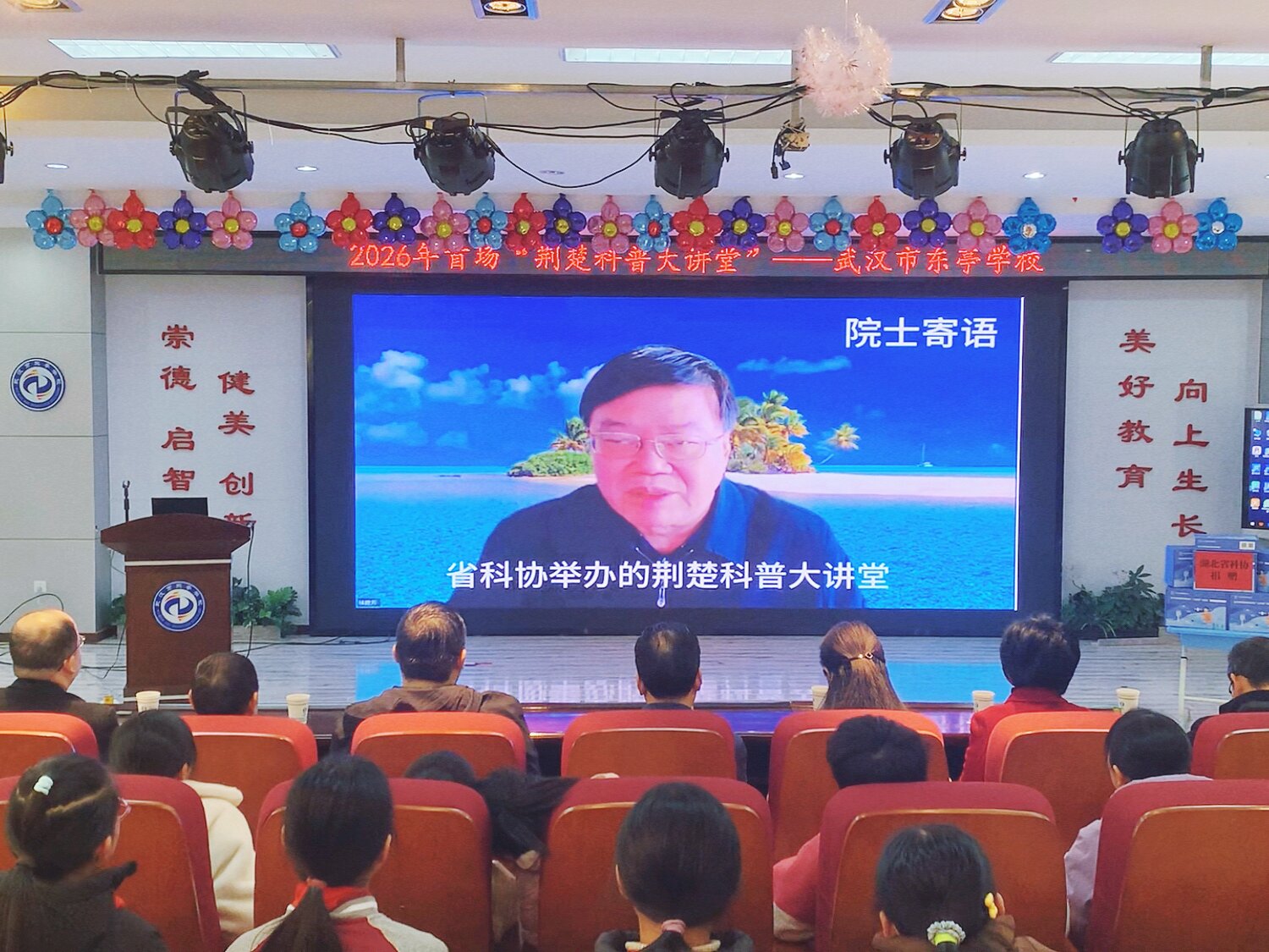 1月9日下午,2026年“荆楚科普大讲堂”首场报告在武汉市东亭学校开讲。湖北大学教授、博士生导师黄辰以《无处不在的AI大模型—我们身边的人工智能》为主题,为学校师生作了一场科技与人文的科普报告。省科协党组成员、副主席朱志斌出席活动,现场向学校捐赠30套青少年科学调查体验资源包。