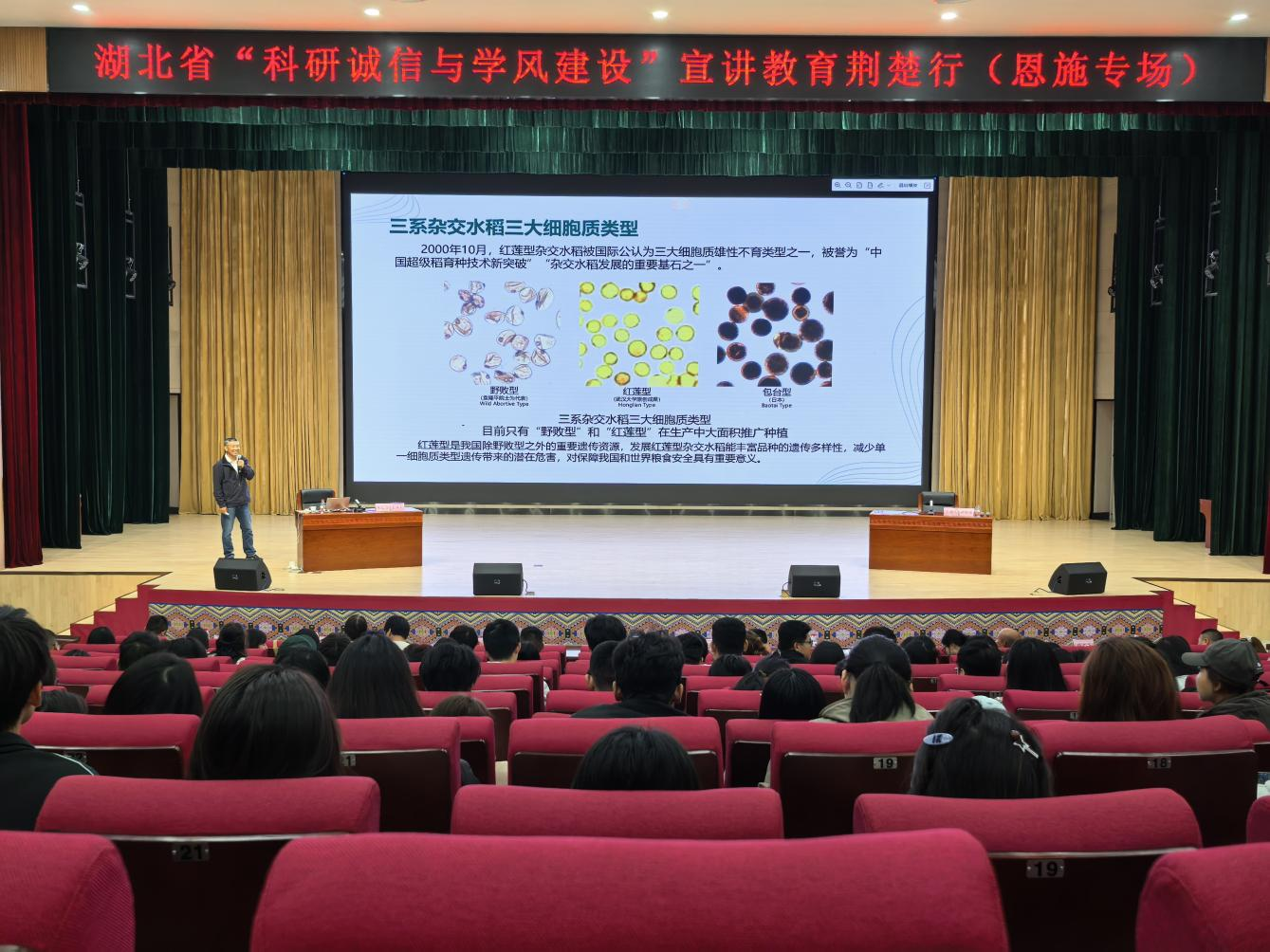 10月15日,湖北省“科研诚信与学风建设”宣讲教育报告会走进湖北民族大学和恩施职业技术学院。湖北省科学家精神宣讲团成员,国家水稻产业技术体系岗位科学家,杂交水稻全国重点实验室(武汉大学)教授级高级工程师朱仁山,湖北省乡村规划研究会副会长兼秘书长、湖北省农业规划设计研究院常务副院长周胜利分别为两院校师生代表作宣讲报告。