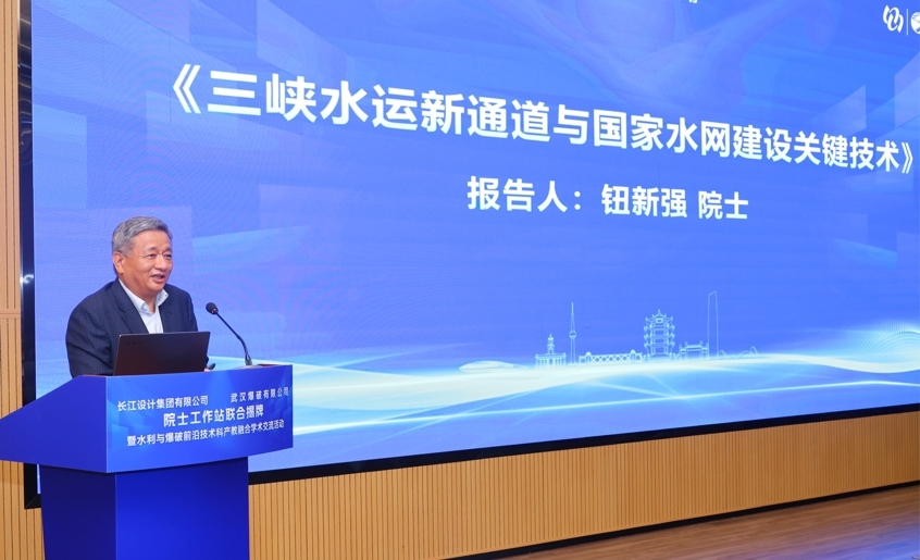 揭牌活动结束后,钮新强院士作《三峡水运新通道与国家水网建设关键技术》专题报告,围绕三峡水运新通道关键技术、国家水网建设的战略意义与技术发展方向等内容进行讲解。他指出,三峡水运新通道及国家水网建设均需水利与精细爆破深度融合,希望以院士工作站为平台,加强校企协同、联合攻关。他鼓励青年人才投身水利事业,为国家重大工程建设与科技自立自强贡献力量。报告内容兼具专业性与前瞻性,引发现场热烈反响。现场嘉宾、师生围绕报告内容以及水利、爆破领域的技术难题、发展趋势等踊跃提问,钮新强院士逐一细致解答。