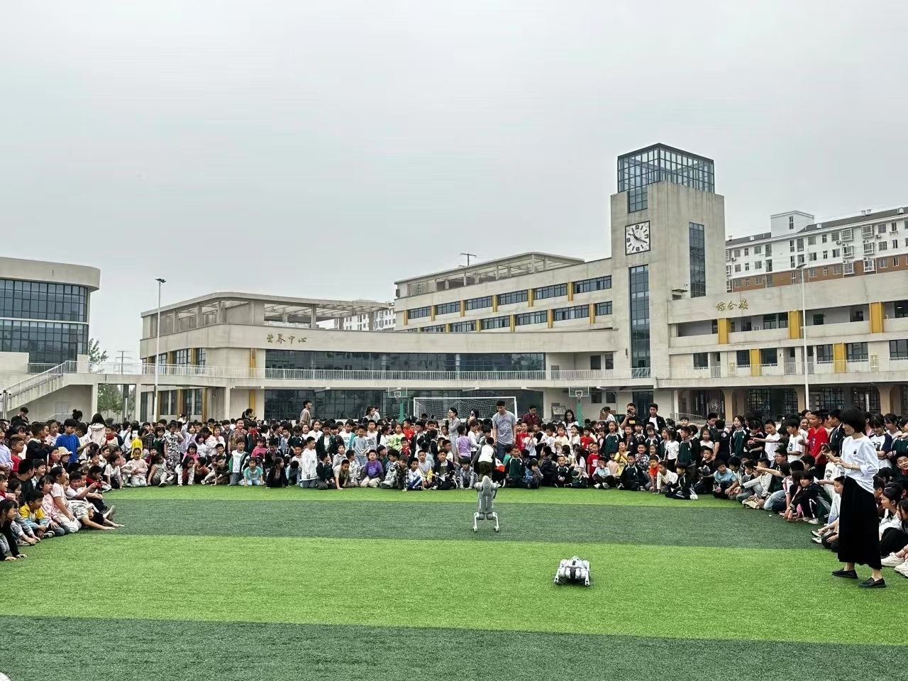 操场中央的机器狗表演掀起活动高潮。两只智能机器狗随着指令完成奔跑、跳跃、作揖等高难度动作,还俏皮地“比心”互动,引得全场欢呼不断。科普志愿者现场揭秘机器狗的传感技术与编程逻辑,学生们惊叹道:“科技让想象变成了现实!”