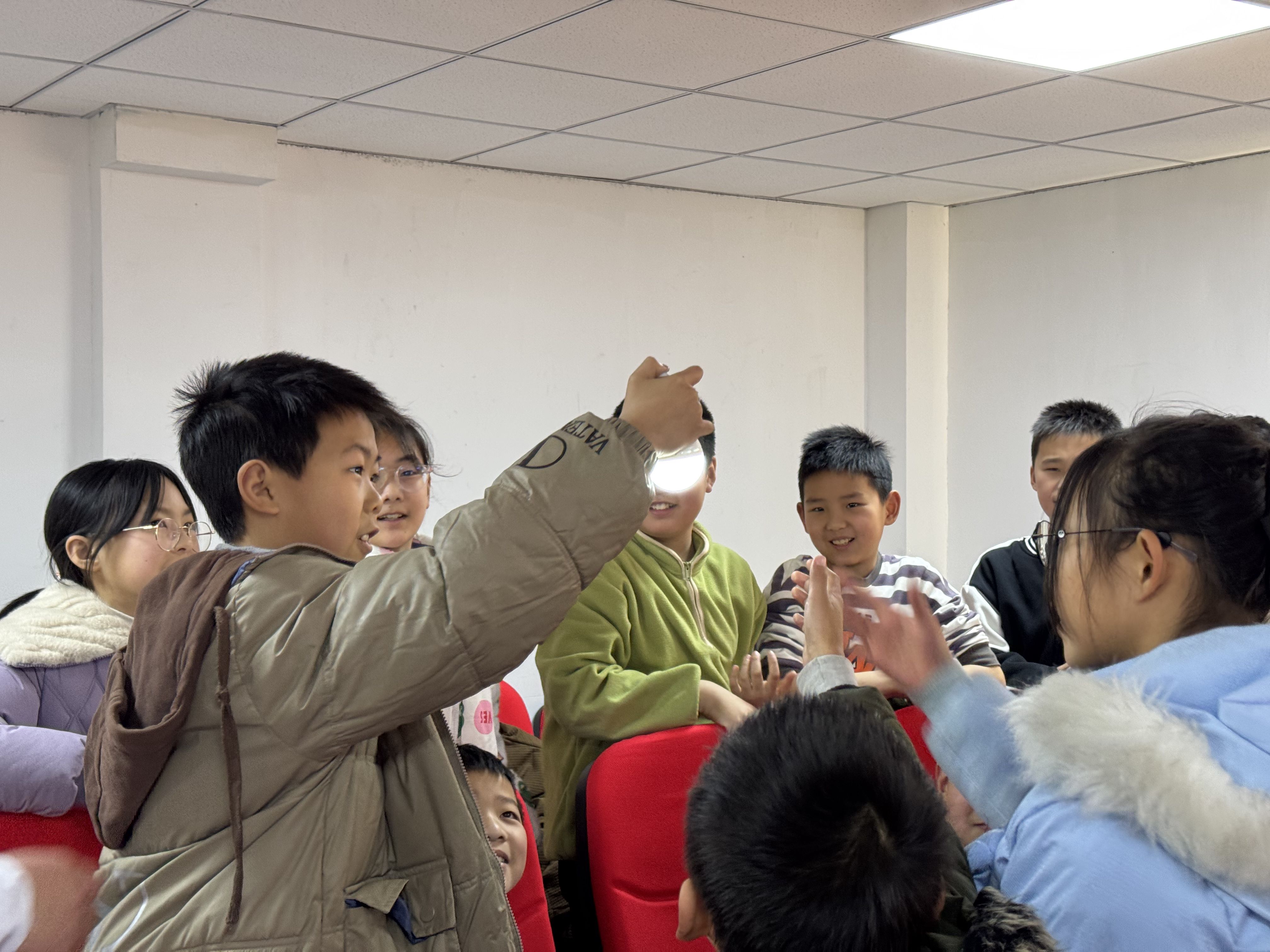 "接下来我们要用身体发电!" 展教老师话音未落,便握住应急灯的金属片。随着电流回路的形成,原本普通的应急灯在她掌心亮起。这个通过人体导电原理的趣味实验,将抽象的电学原理转化为直观的体验,引发了孩子们的强烈好奇,迫不及待地想要触碰科学的奥秘。