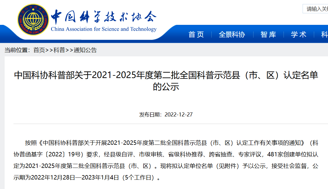 中国科协科普部最新发布关于2021-2025年度第二批全国科普示范县(市、区)认定名单的公示,经县级自评、市级审核、省级科协推荐、跨省抽查、专家评议,481家创建单位拟认定为2021-2025年度第二批全国科普示范县(市、区),其中咸宁市咸安区、赤壁市榜上有名。