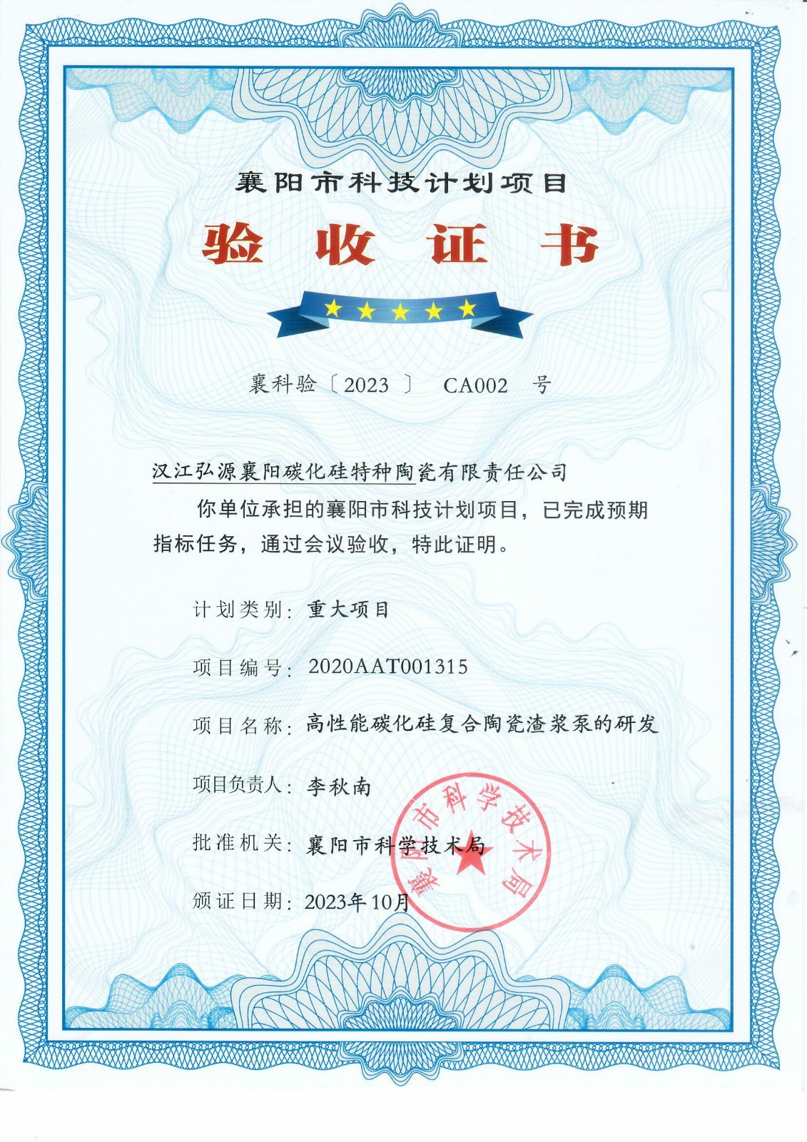 王为民教授与弘源碳化硅公司联合承担的湖北省重点研发计划项目《高性能陶瓷基复合材料制备关键技术研究与应用》、湖北省高价值知识产权培育工程(专利类)项目《高性能碳化硅陶瓷复合材料在渣浆泵的应用研究》、2021年度隆中人才支持计划(B类)《高性能碳化硅陶瓷泵研发及产业化》均已顺利通过验收,为公司获得215万政府资金支持,推动了公司碳化硅陶瓷科技成果的产业化进程。