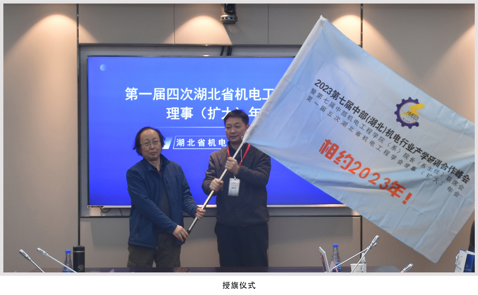 最后,会议就下一届大会承办单位进行了表决。会议代表一致通过2023第七届中部(湖北)机电行业产学研训合作峰会暨第七届中部机电工程学院(系)院长(系主任)联席会将于2023年在武汉召开,会议将由武汉纺织大学承办,并举行授旗仪式。武汉纺织大学机械工程与自动化学院院长余联庆教授从赵大兴会长手中接过会旗,并诚挚邀请各位代表,2023欢聚相约在武汉纺织大学,交流思想、分享经验,携手合作、共谋发展!