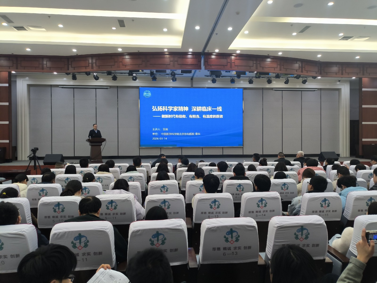 吴南教授深耕脊柱矫形手术,成功帮助无数脊柱畸形患者实现了“昂首挺胸”的梦想。其团队构建起世界最大的脊柱畸形遗传研究体系,实现了我国骨科学者在这一领域的突破性进展,更让中国人成为这一国际研究的领头雁。他的报告结合自身临床实践与科研经历,从“时代之问”“精神之核”“实践之窗”“经验之谈”“未来之嘱”五个方面分享其服务患者、精研医术的奋斗故事与精神感悟,通过鲜活案例阐释科学家精神在医学领域的现实意义,强调医者需“知行合一,久久为功”,扎根基层、守护健康、不负时代、不负人民。整场报告立足临床实际、紧扣医者使命,深刻诠释新时代医务工作者应如何坚守初心、钻研医术,以仁心仁术践行医者担当,在深耕一线中传承求真务实、爱国奉献的科学家精神。重点阐述了“不轻视每一台手术、不放弃每一个病人,把临床问题当成科学问题去解决”的实践感悟。他用鲜活的成功案例,分享了自己“带团队、传经验、育新人”教学相长的成长经历,引发现场医护人员共鸣点赞。