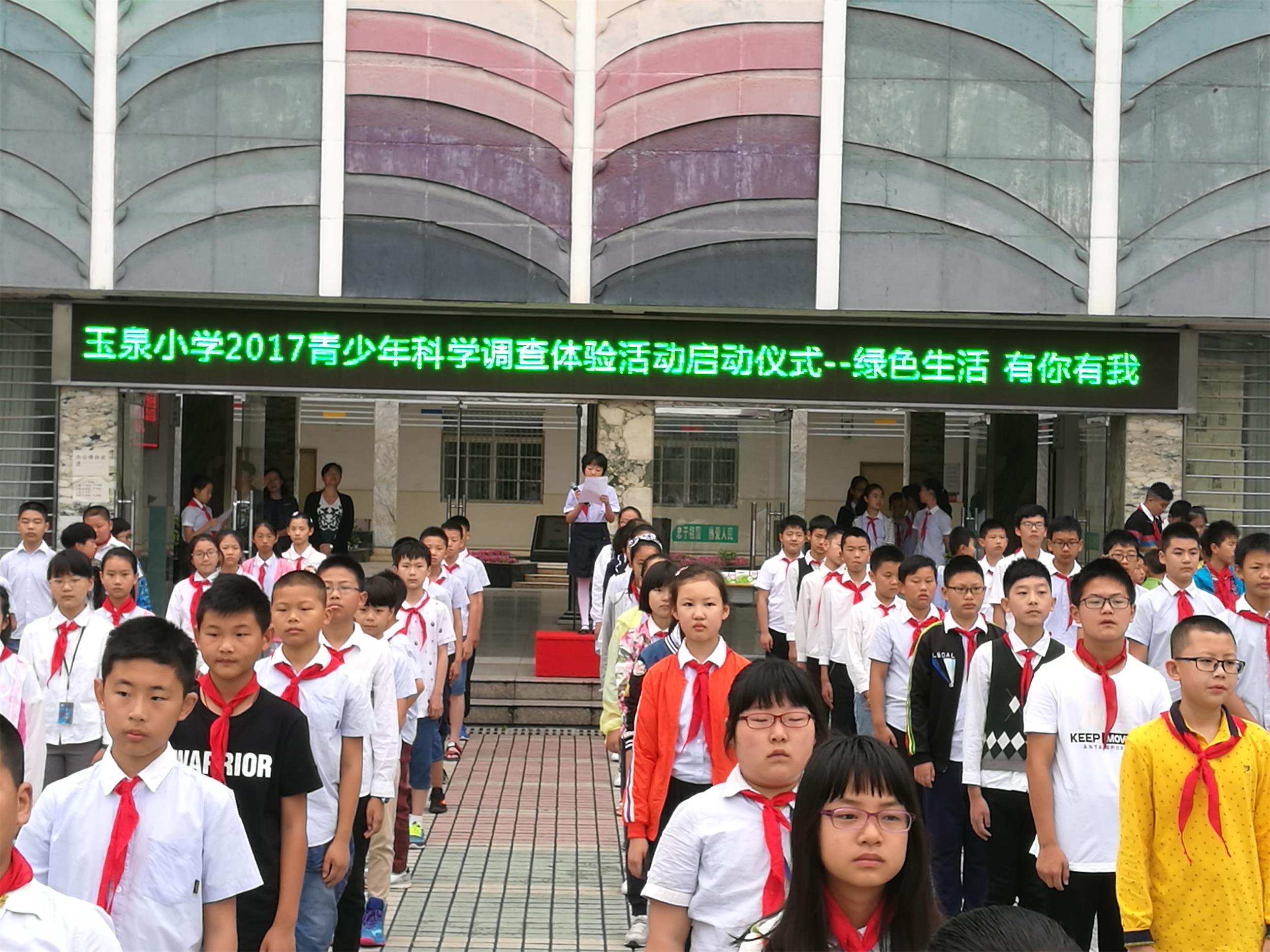 2017年6月5日,孝感市玉泉小学全体师生参加了“我爱绿色生活——2017年青少年科学调查体验活动”启动仪式,迎接第46个世界环境日的到来,传递绿色、低碳、节能、环保的生活理念,共建绿色地球美好家园。