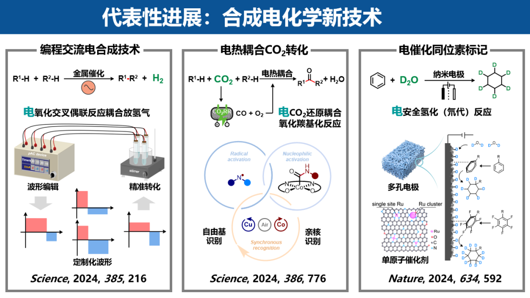 武汉大学雷爱文团队在合成电化学领域接连获得重要突破,7月在《科学》上首次报道可编程波形交流电合成技术,成功发现了两类阳极氧化耦合阴极放氢气反应。通过编辑交流电的频率、电流和占空比等参数生成定制化的波形,实现对过渡金属催化物种的精准控制,突破了直流电催化对隔膜电解池的依赖。该研究为电子精准控制技术转嫁到电合成上创造了机会和条件;8月在《自然》发表纳米金属阴极催化还原氘代反应,通过电催化阴极还原策略,以廉价易得的氘水为氘源,高效构建传统方法难以合成的高价值氘代药物。该研究充分展示了合成电化学在药物开发和实际应用中的巨大潜力与广阔前景;11月在《科学》报道了电还原二氧化碳耦合氧化羰基化反应模式,将工业上最常用但有毒有害的一氧化碳升级替换成惰性无毒的二氧化碳,高效合成了医药和农药领域有重要应用的非对称脲。电热耦合模式推广到化工生产中将有望消纳二氧化碳,在物质转化层面助力国家碳达峰碳中和的发展战略。合成电化学新技术不仅在绿色物质制造等领域的广泛应用提供了新路径,还为化学化工的智能化和高端化发展注入了全新动能。这一系列成果标志着合成电化学技术迈向了精准化与多样化的台阶。