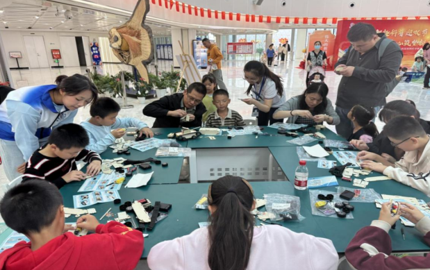 在创客工坊,空气悬浮球、避障机器人等趣味制作将能量转换、流体力学等抽象原理化为直观体验。一位成功让小球稳定悬浮的孩子兴奋地举手:“我知道了!这个原理和楼上童梦乐园展厅那个小球展品是一样的!”这正是活动的精妙设计——让科技小制作与展厅展品内容紧密联动。通过参观体验+动手制作,让孩子们在“看中学、做中悟”,不仅深化了他们对科学原理的理解,更提升了其动手实践能力。