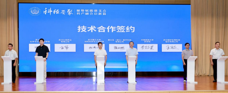 技术合作签约环节,武汉大学化学与分子科学学院、武汉理工大学材料科学与工程学院、中南民族大学药学院等专家团队,分别与武汉久安药业有限公司、爱亿生(湖北)医疗科技有限公司、武汉超好生物科技股份有限公司成功签署技术合作协议,形成一批合作意向和成果。
