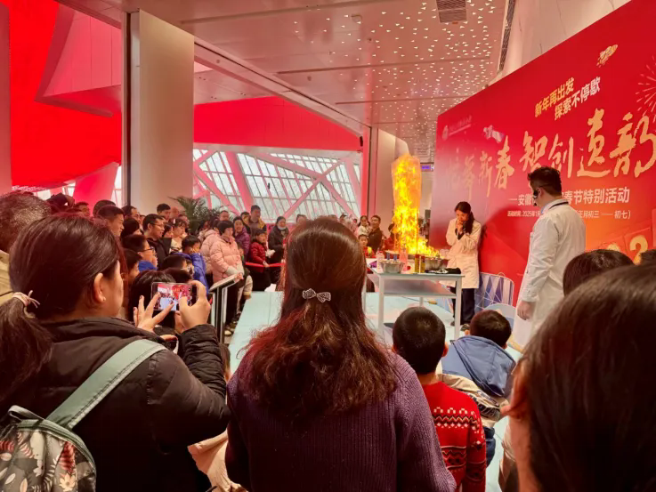 安徽省科技馆精心策划了一场“蛇舞新春 智创遗韵”春节特别活动,共设置“福蛇迎春”工美非遗集市、“蛇舞新春”科学表演秀、“画蛇添福”研学营三大版块。开展“福蛇迎春,工美非遗集市”非遗技艺展演剪纸、面塑、蛋雕等技艺展示和亲子体验活动,受众约2000人次。开展“蛇舞新春”科学表演秀《蛇年静电飞花秀》《蛇年猜猜乐》《金蛇腾舞》《甜甜蜜蜜过新年》《蛇年异火秀》等活动24场次,“画蛇添福”研学营《福满高铁,春启科航》《太空上面过大年》《遇见扎染 布里生花》等活动28场次,也受到公众热烈欢迎。