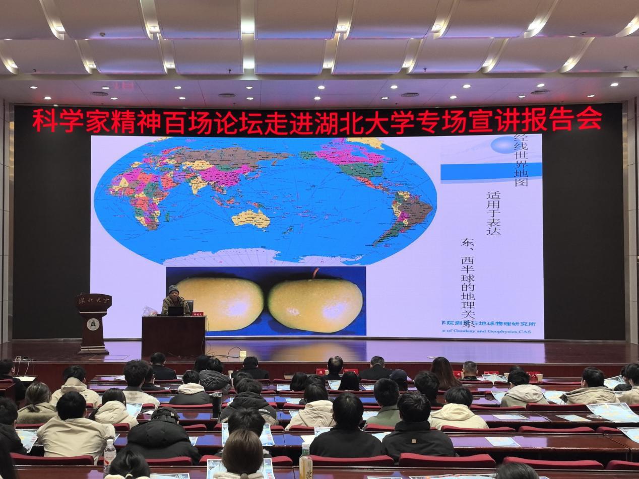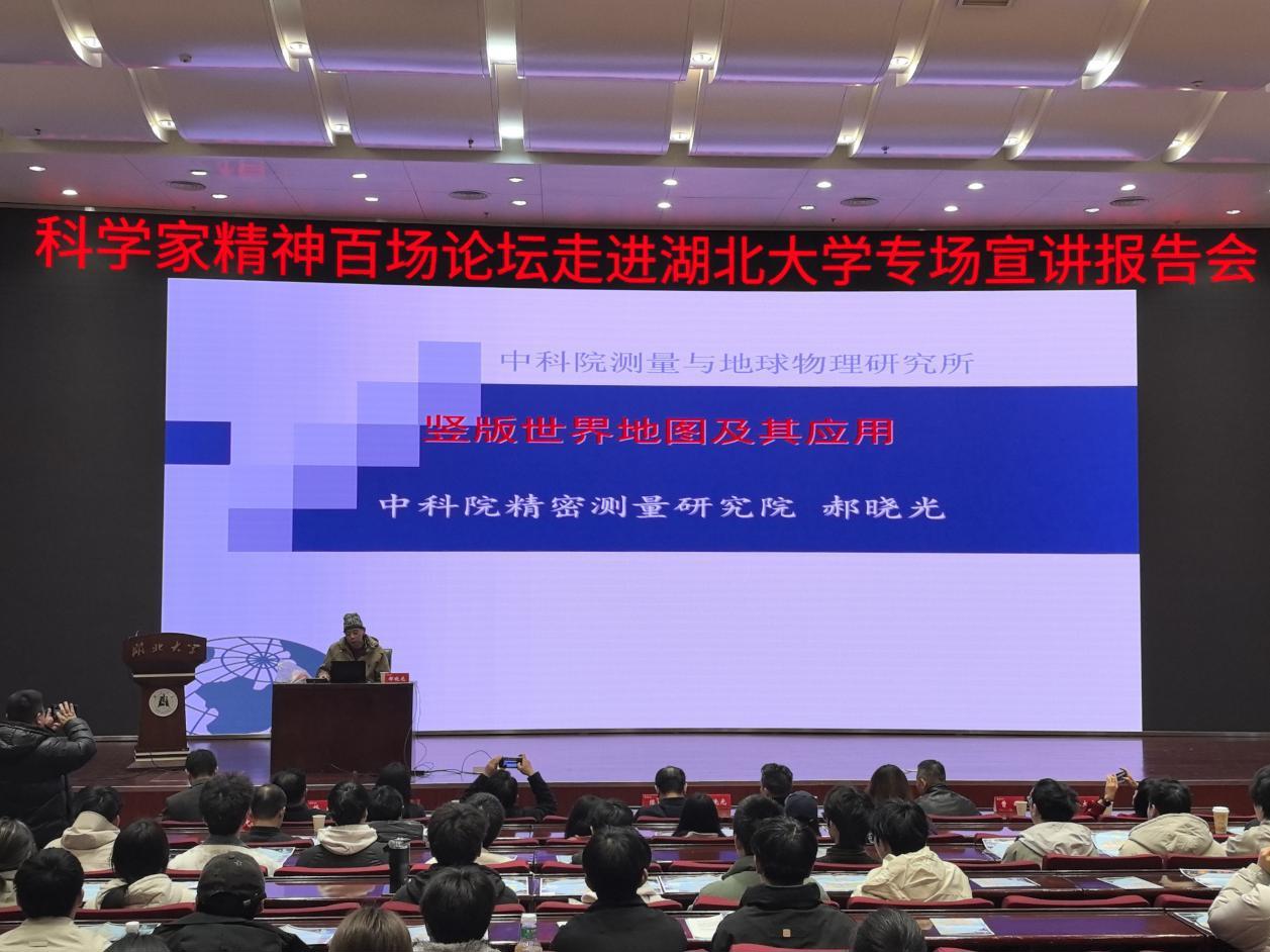 3月18日,湖北大学会议中心思睿厅内座无虚席,“科学家精神百场讲坛”在此举行。中国科学院精密测量科学与技术创新研究院研究员郝晓光带来一场题为《竖版世界地图——换个角度看世界》的精彩报告,用一个“竖起来”的地球视角,颠覆了现场师生的地理认知,开阔了视野。