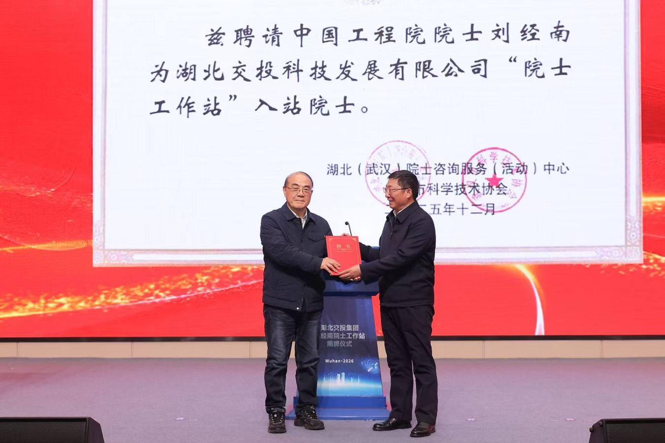 1月9日,湖北交投科技发展有限公司院士工作站启动仪式在湖北交投集团总部大楼举行。省科协党组成员、副主席孙建刚出席,向入站院士颁发聘书,共同启动院士工作站。