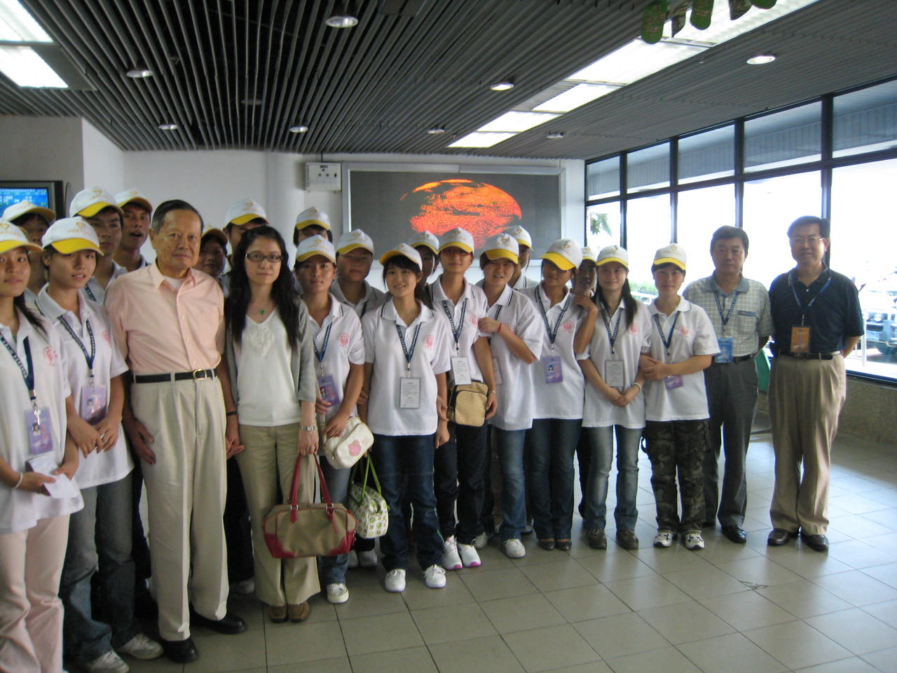2007年9月7日,在华师一附中的演讲现场,杨振宁接过学生科学院的标志