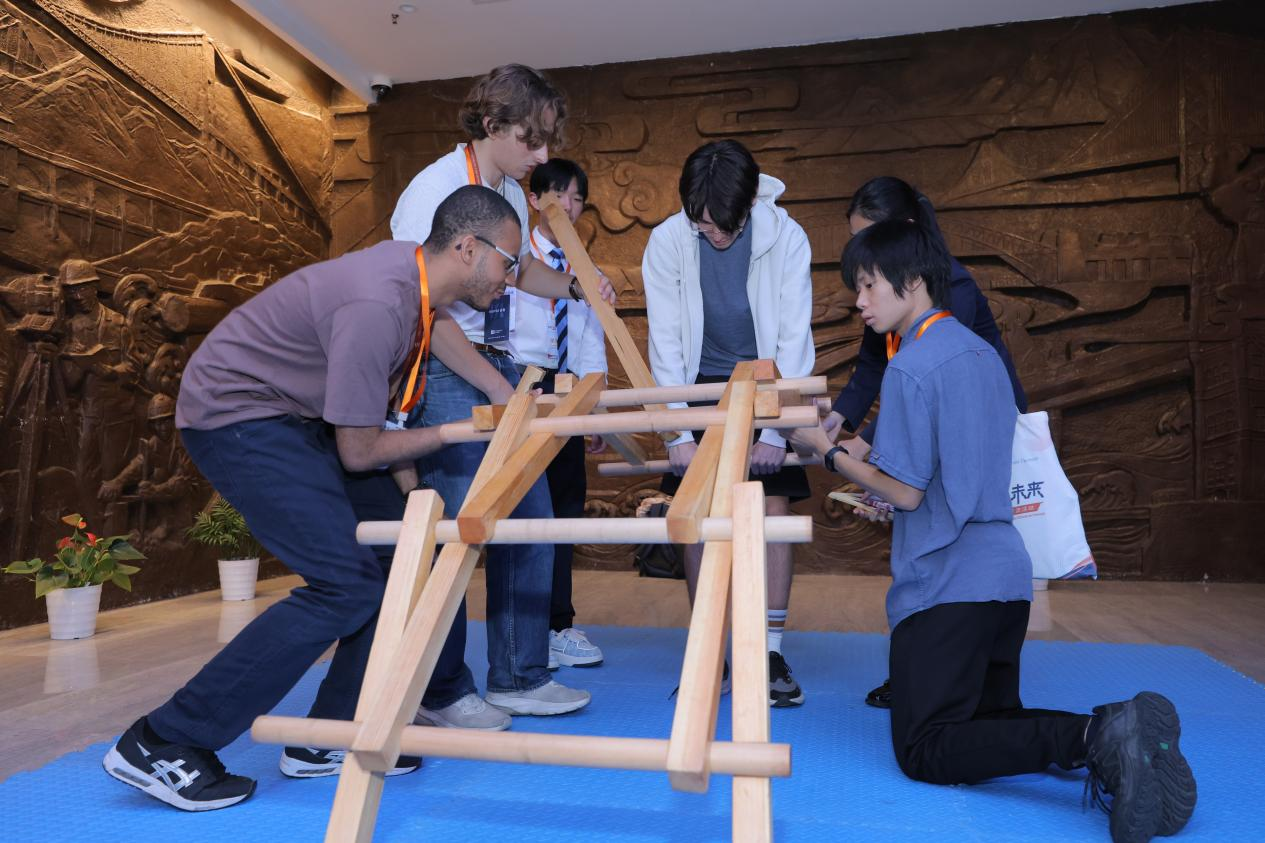 最令青年们期待的当属贯木拱桥搭建实践环节。青年们分成两组,分工协作、各司其职,过程中不时传来讨论声与笑声。经过一番通力合作,两座稳固的贯木拱桥顺利落成。当看到自己参与搭建的桥梁很能载重,青年们纷纷踏上“桥面”,亲身体验创造的成就感,桥梁上的身影与展厅内建桥者的工作场景相映成趣,成为馆内一道鲜活的风景线。
