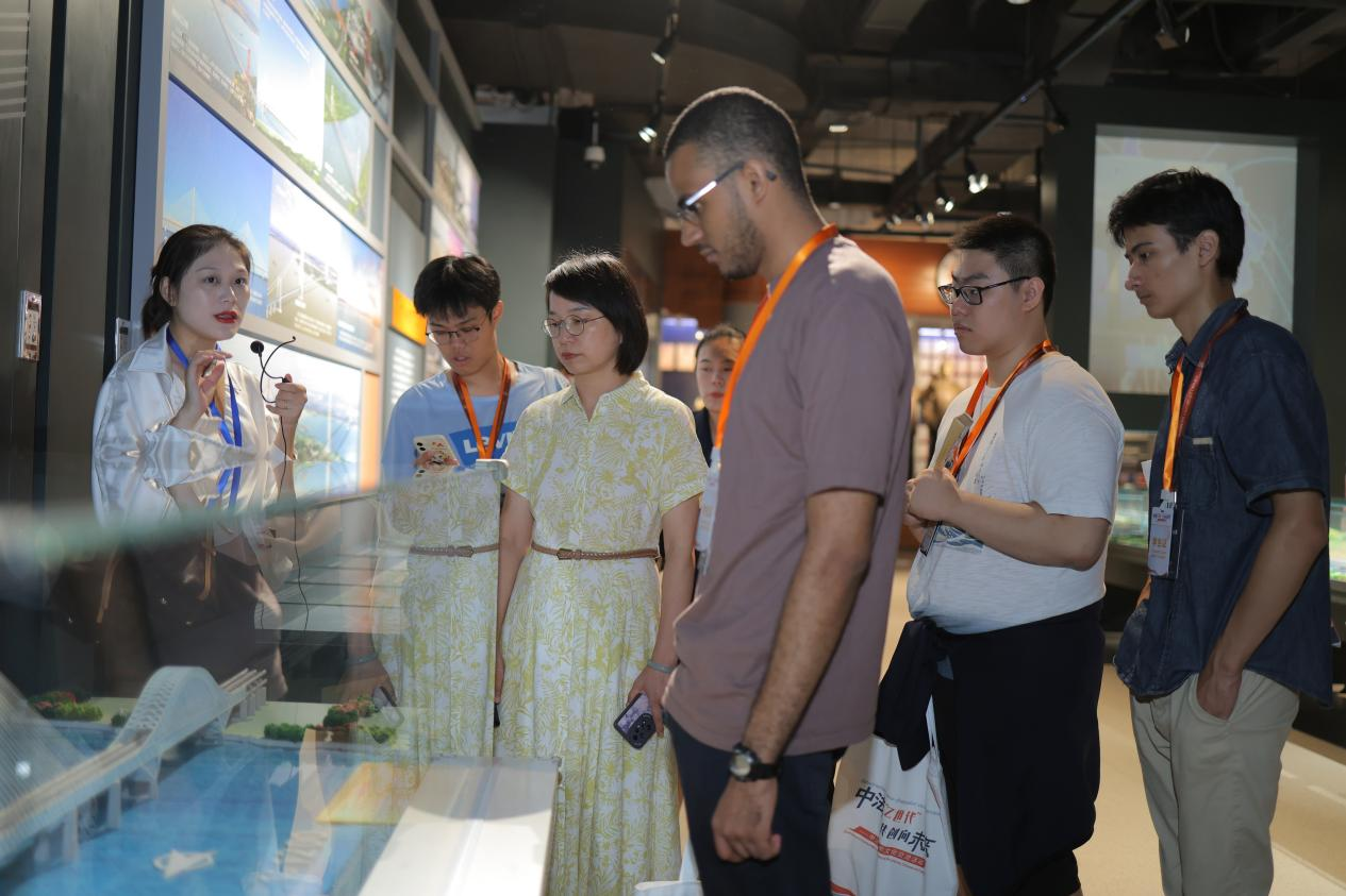每到一处,中法青年都忍不住交流心得,法国留学生对着古代石桥的复刻模型好奇询问建造工艺,中国青年热情解读,也积极分享现代大桥背后的故事,文化与技术的碰撞在展区内自然发生。