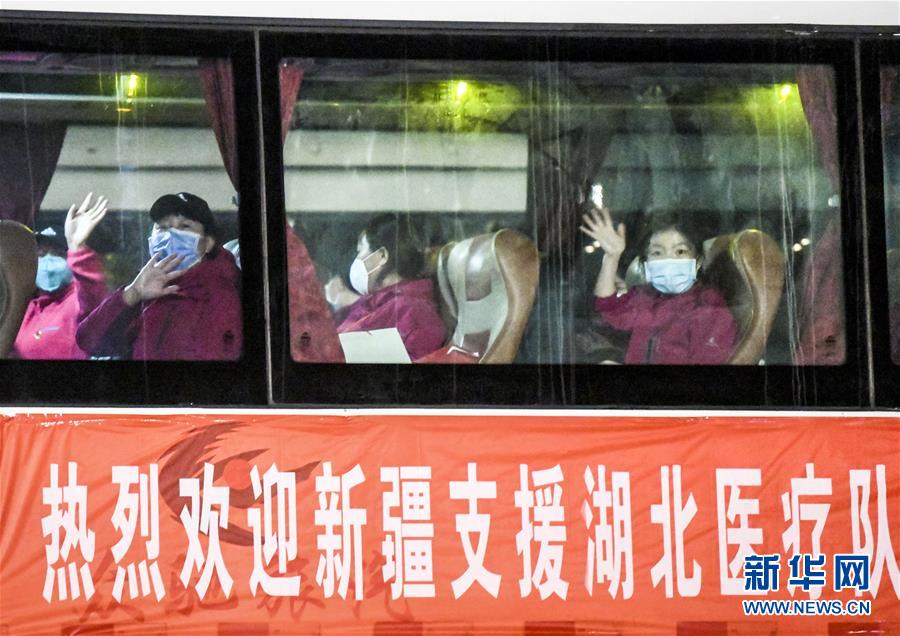 3月17日,在新疆乌鲁木齐地窝堡国际机场,医疗队队员坐上大巴车准备离开。新华社记者 王菲 摄